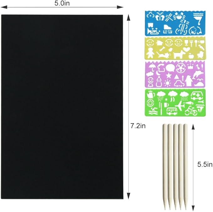 - SCRATCH RAINBOW ARTS KIT INCLUDED: 100 Pcs scratch paper, 100 Pcs wooden stylus, 4 Pcs drawing stencils. Many accessories in our scratch paper art can make children enjoy themselves. They can use the stencils for design more cute and colorful shapes,which will give them hours of fun and creativity