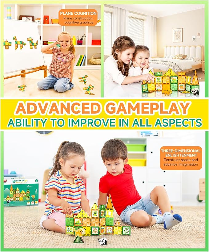 - [Educational and Imaginative] Designed as magnetic toys for kids ages 3 - 8,Spark hours of imaginative fun with this magnetic tiles for kids set featuring a Animal theme! Includes 47 colorful diamond-shaped blocks, stairs, windows, a creative manual, and 2 realistic animal figures, —kids build dream castles, solve puzzles, and role-play stories. Ideal for solo or group play, it combats boredom and fosters STEM skills in any indoor setting