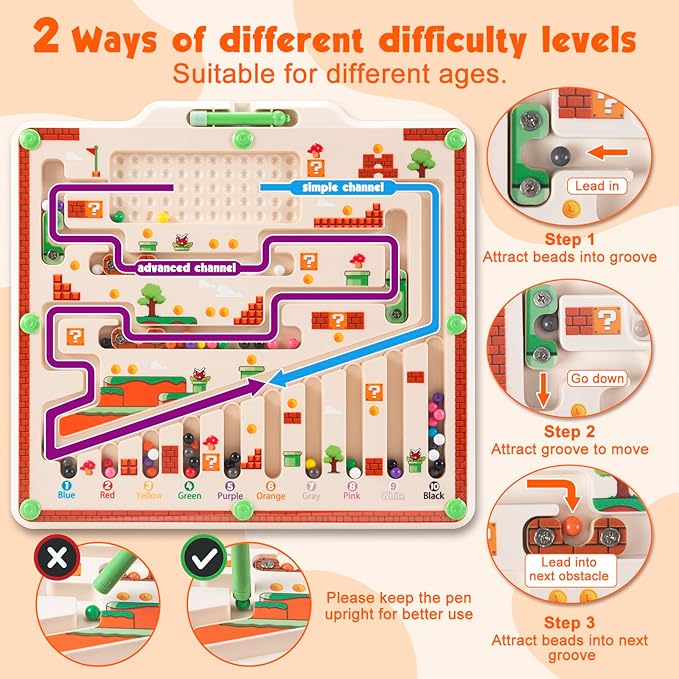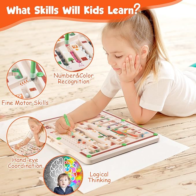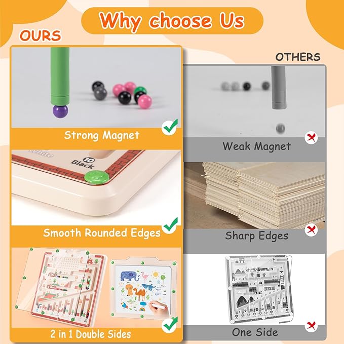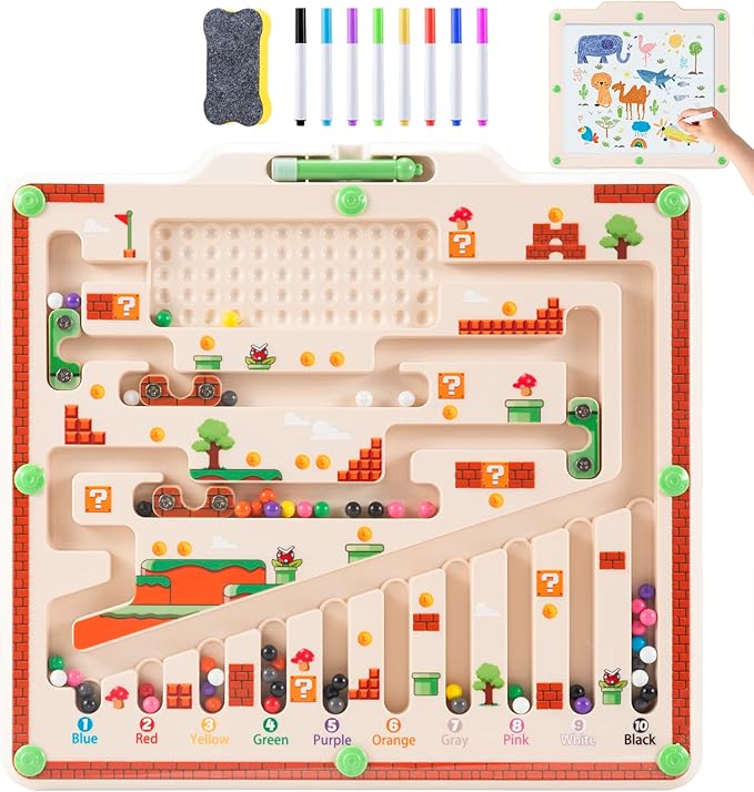 - 4.【Double Sides, Muliple Joys】Double-side design: the front side is magnetic maze board while the back side is a whiteboard for drawing. Children can draw on the back side with our bonus pen and eraser