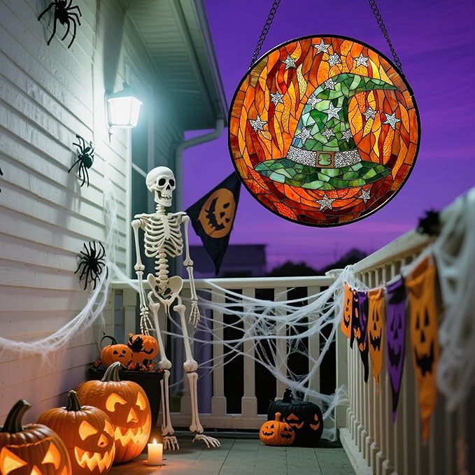 Stained Glass Window Hanging - Halloween Decorations Witch Hat Suncatcher for Doors Garden Indoor Spooky Funny Green Sun Catchers Gothic Decor Horror Gifts for Women Men Friend 15 in