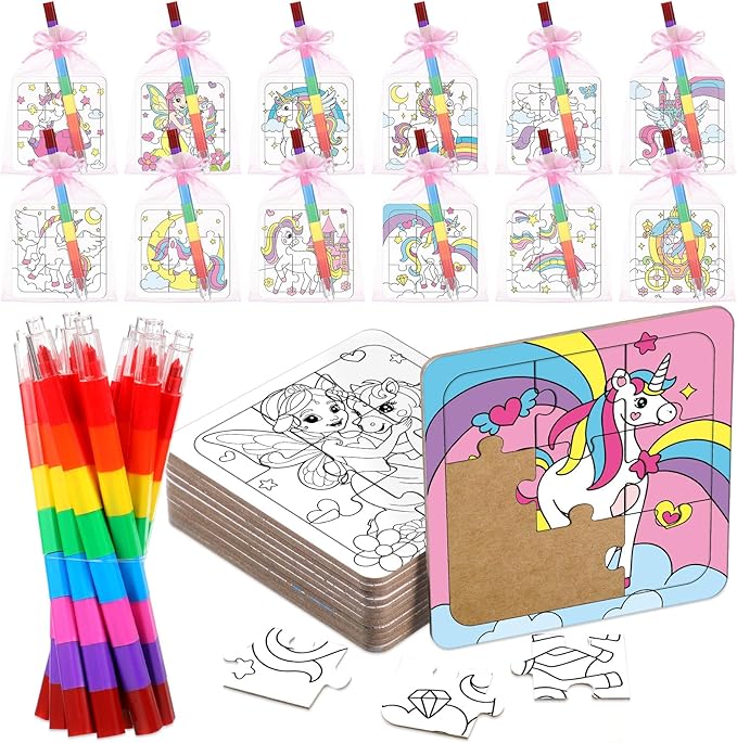 - DIY Crafting Fun: put these scattered puzzle pieces together, then apply the included 12 color crayons to color the blank unicorn puzzles, you will be very happy to complete this interesting activity, suitable for endless unicorn fun