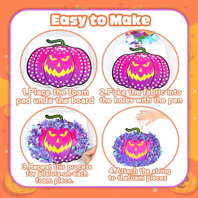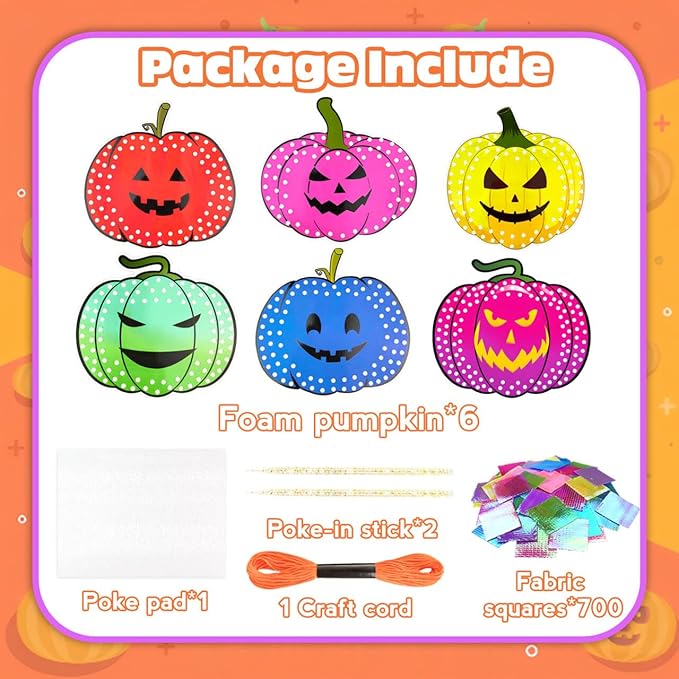 - 【Halloween Craft Kits for kids 】This poke art and crafts kit includes 700 fabric squares,Pumpkin*6,1Craft cord,2 poke-in sticks,a poke-in pad,kids can make their own halloween arts crafts set!DIY Pumpkin Craft Kits for kids ages 4-8+,perfect for developing early crafting skills