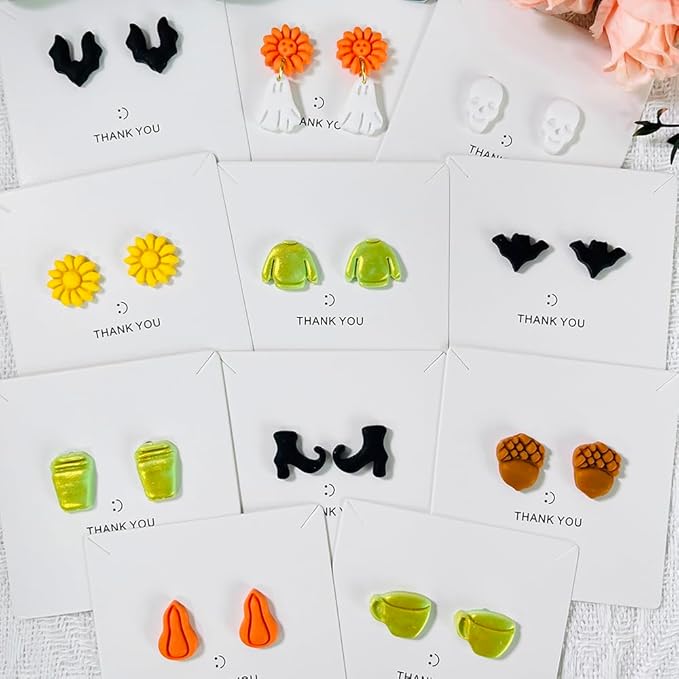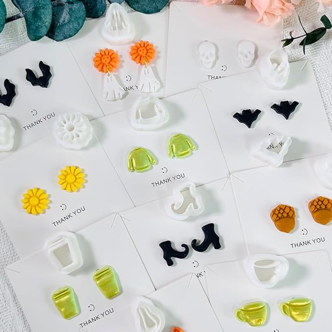 - These 12PCS Halloween clay cutters feature cozy fall and spooky themes like pumpkin, sweater, boots, skull, perfect for seasonal clay earrings or mini jewelry projects.
