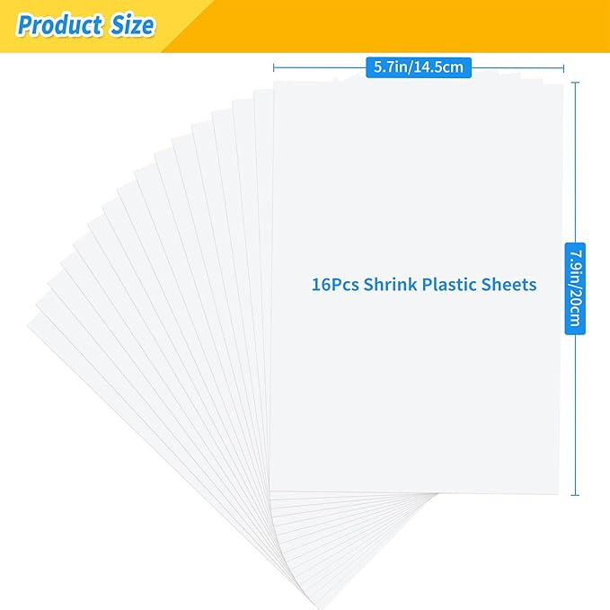 - 【Great Value Set】16 sheets of shrink film (7.9 inches × 5.7 inches, 0.3mm thick, shrinks to 20% of its original size after processing). It's enough to make a lot of shrink film crafts.