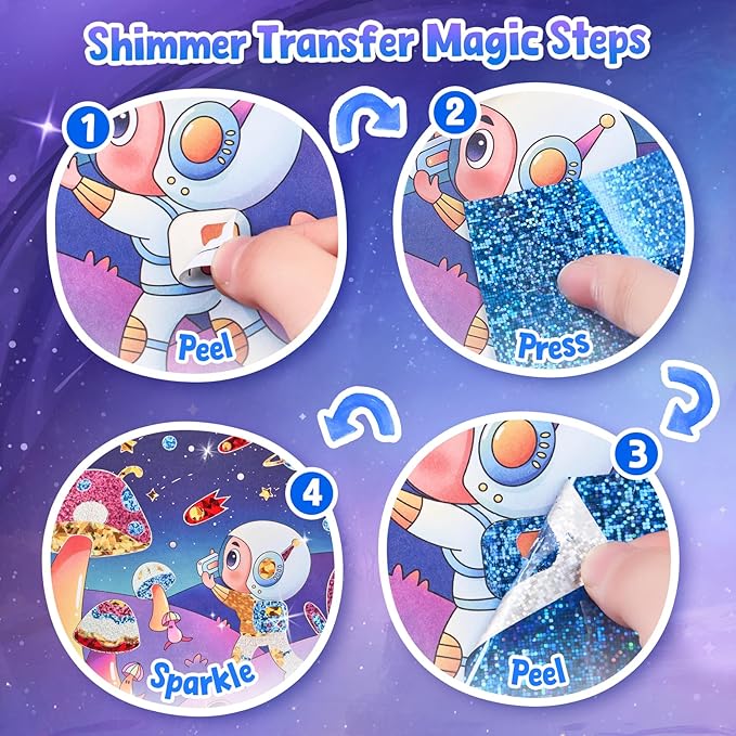 - Sparkling Craft Art, Easy to Create Stunning Space Effects: Craft is simple yet incredibly fun! Simply peel away parts of the design to reveal the sticky surface, apply the sparking pieces, then gently peel it off to reveal a dazzling space artwork. Not only will kids experience the joy of success, but they will also improve their focus and fine motor skill from this craft activity. The vibrant princess-themed artwork will leave kids proudly showcasing their creations