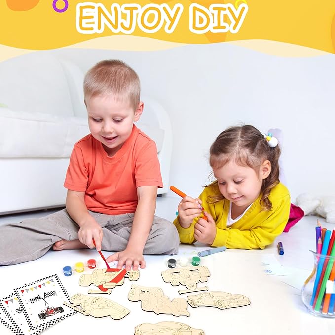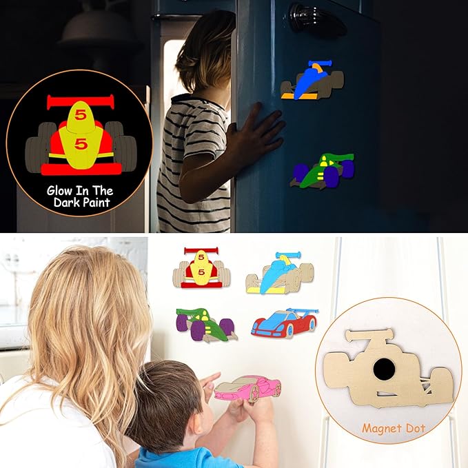 - Comprehensive Set: This all-in-one race car Party Favors craft kit has everything young artists need: 24 magnetic sticker , 24 cards, 24 unique woodchips ( 6 race car shapes), 72 vibrant paints, 24 glow-in-the-dark paints, 24 brushes, and 24 clear bags. Perfect for hours of creative fun!