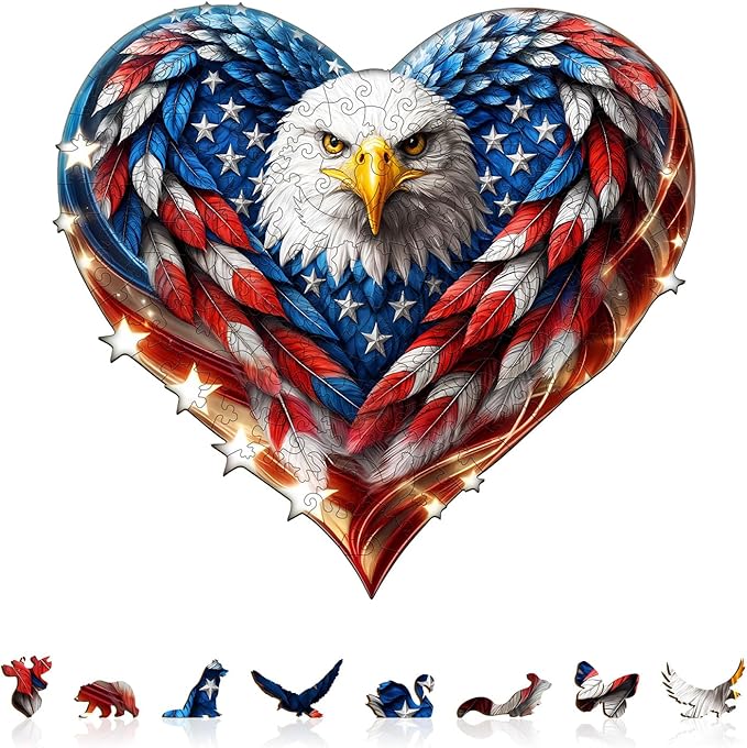 - 【Wooden Puzzles for Adults】A wood puzzle presents a heart - shaped design centers on a bald eagle. Its feathers mix the red, white, and blue of the American flag, with stars and glowing star details, radiating patriotic charm.