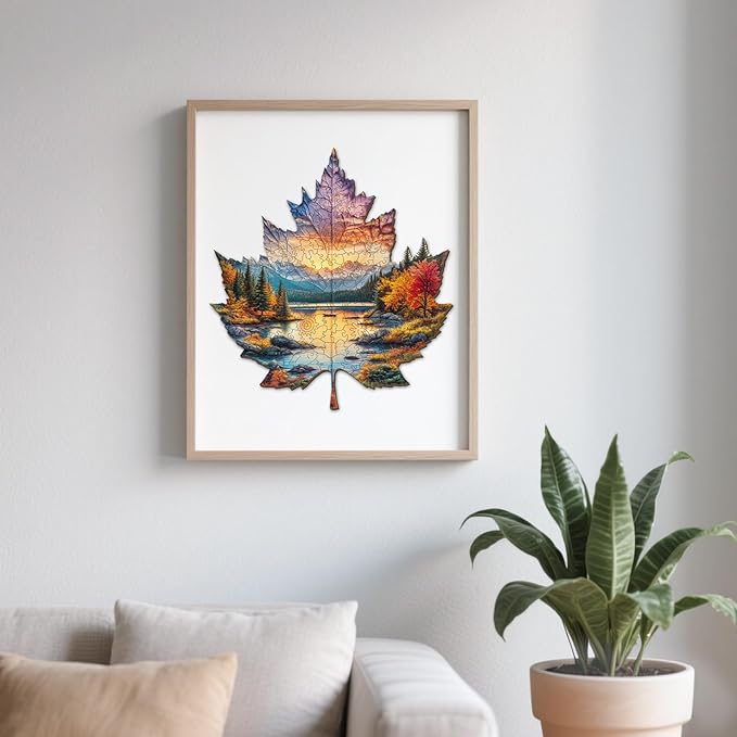 - 【Wooden Puzzles for Adults】This wooden puzzle is shaped like a maple leaf. It features a stunning autumn lake scene at sunset. The sky displays hues of purple, pink, and orange, reflecting on the calm lake. Around are colorful fall trees, evergreen pines, and rocks, forming a picturesque wilderness view.