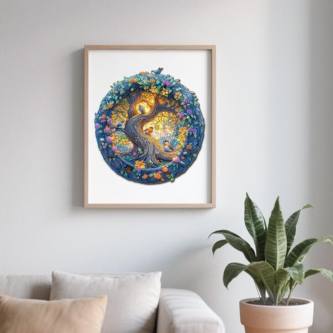 - 【Wooden Puzzles for Adults】This wooden puzzle shows a circular scene of jungle twined with vivid flowers, where birds perch on branches, all bathed in warm sunlight, crafting a lively and enchanting natural picture.