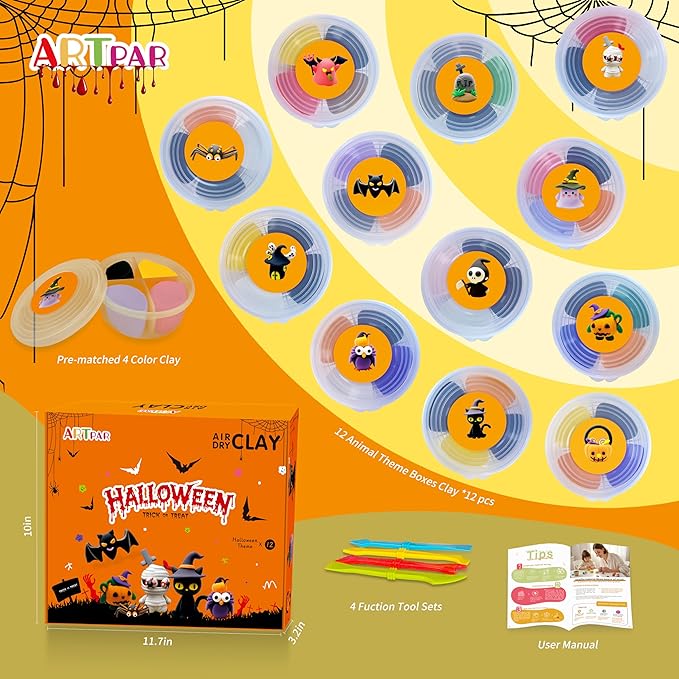 - Artpar Air-Dry Clay Halloween Kits:Halloween Crafts Modeling Clay with 4 Sculpting Tools and Project Tutorials, the air dry clay set is packaged in 12 boxes, each jar has 4 small compartments filled with different colors of clay, 12 Halloween-Themed Designs – Create spooky pumpkins, ghosts & bats with included step-by-step guide!