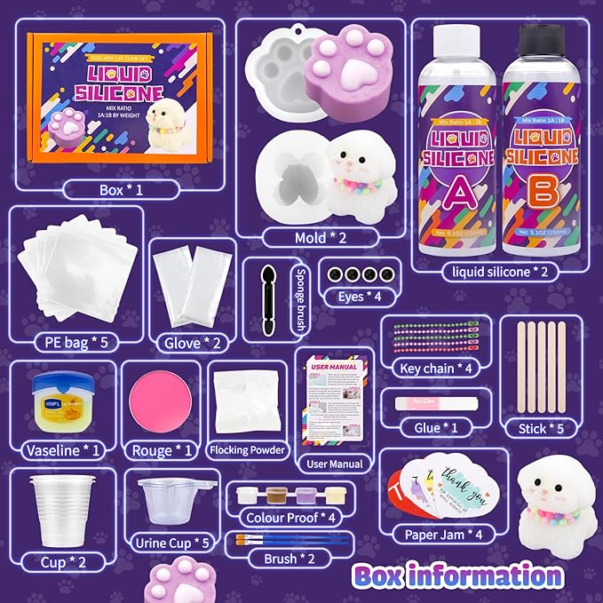 - taba squishy kit: The set includes 5.1-ounce silicone A and 5.1-ounce silicone B, dog molds and cat paw molds, measuring cups, mixing cups, stirring rods, lubricating oil, brushes, paints, doll eyes, gloves, pvc bags, cardstock, and is very suitable for beginner players