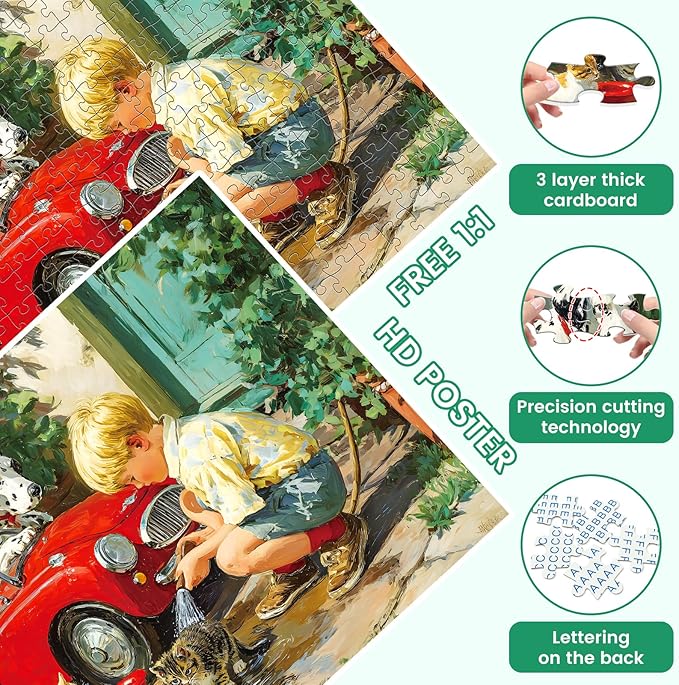 - Vibrant Puzzle :The jigsaw puzzle depicts a playful courtyard scene. A boy squats on a flagstone floor, playing with toys. Nearby, a dog sits in a red toy car, and two cats lie in front of it. The entire scene is filled with carefree childhood memories