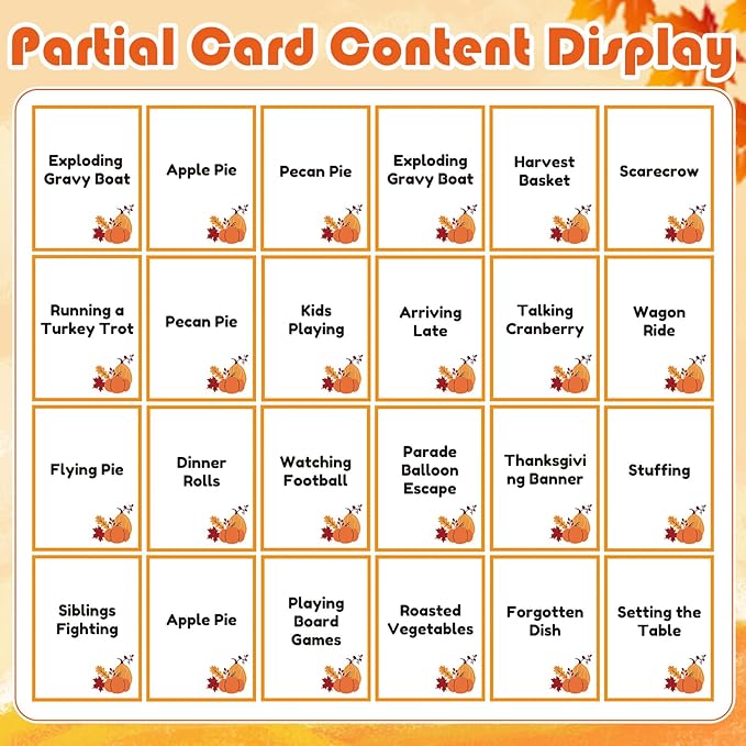 - Style: cards with Thanksgiving themed content, including holiday related prompts such as "Scarecrow", "Watching Football" and "Running a Turkey Trot"; Showing a strong Thanksgiving spirit