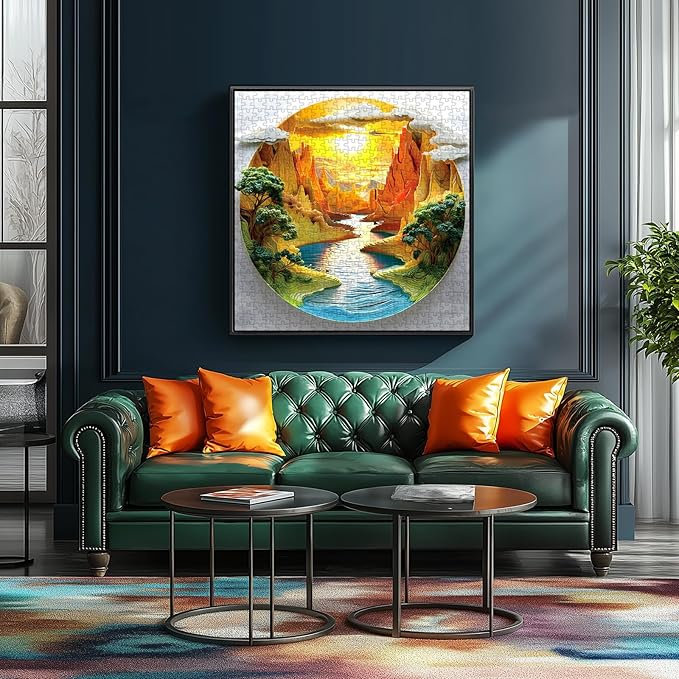 - 🌄 Breathtaking Nature Artwork: Immerse yourself in a stunning circular sunset canyon scene, featuring a winding river, golden cliffs, and lush greenery. The vibrant colors and intricate details—from rippling water to billowing clouds—create a captivating challenge for intermediate puzzlers.