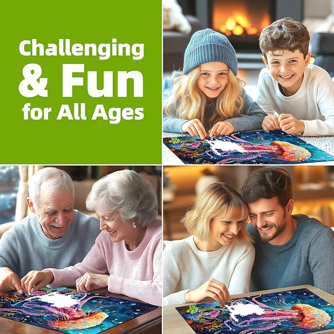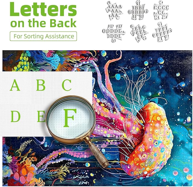 - ๐จ Stunning Underwater Artwork: Dive into a vibrant ocean scene with luminous jellyfish, coral reefs, and rich hues. Perfect for puzzle for adults seeking a visually rewarding challenge.