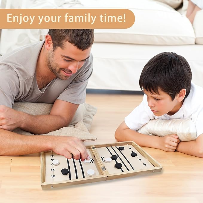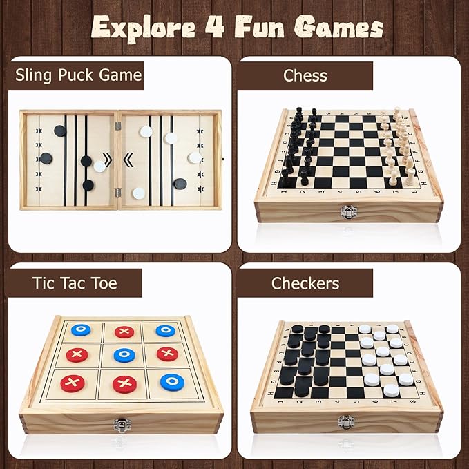 - 4-IN-1 WOODEN BOARD GAME SET: Including Chess, Checkers Game, Tic Tac Toe & Sling Puck Game in a compact foldable design (21.9" to 11" when folded). Perfect for 2-player battles that spark family fun and friendly competition.