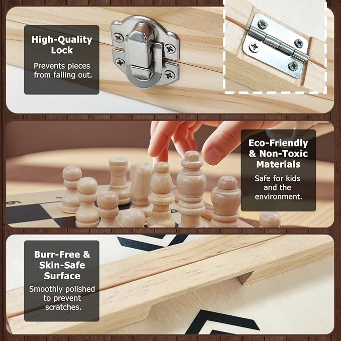 - PREMIUM & SAFE MATERIALS: The checkers and chess board game set made from natural, non-toxic wood with smooth, splinter-free surfaces for child-safe play. Durable and scratch-resistant for years of family fun.