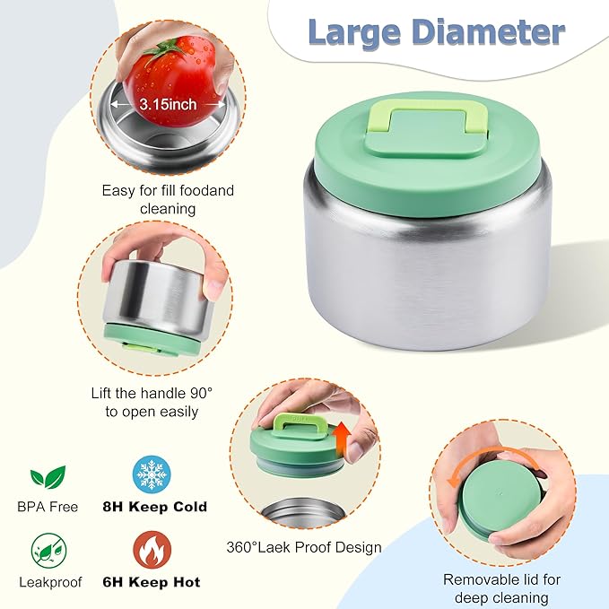 MAISON HUIS Kids Bento Box Set - Includes 8oz Soup Thermo, Insulated Lunch Bag & 17oz Stainless Steel Water Bottle, 5-Compartment Bento Box with Built-In Ice Pack, Leak-Proof & BPA-Free(Green)
