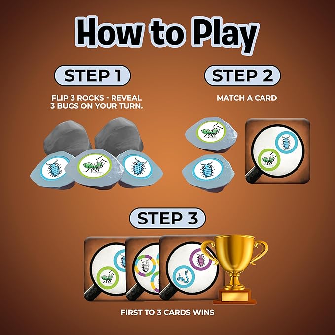 - Bug Matching Fun: Flip 3 rocks to reveal hidden bugs. Match them to the bug combination on the Magnifying Glass cards to score a point. No match? Secretly peek at a 4th rock before flipping them all back. Fun, strategic gameplay for kids that blends memory with excitement.