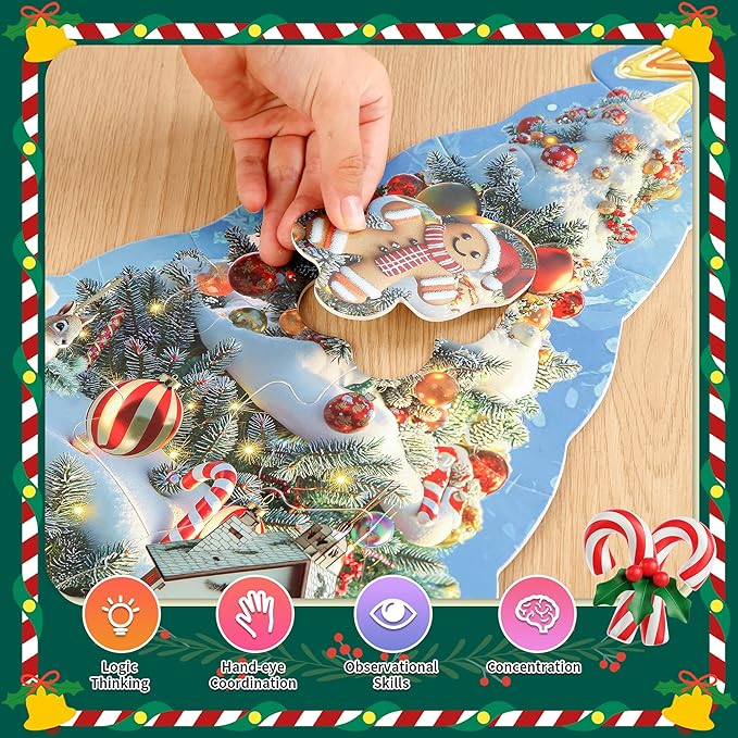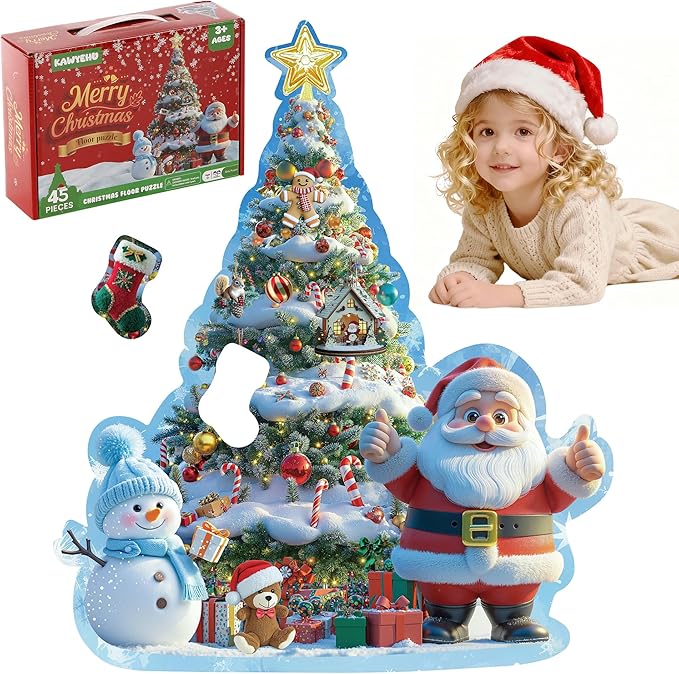 - Christmas 45-Piece Giant Scene: Vibrant floor puzzle featuring Santa, a snowy giant Christmas tree, jolly snowman, gingerbread men, stockings, and a little bear—packed with holiday magic!