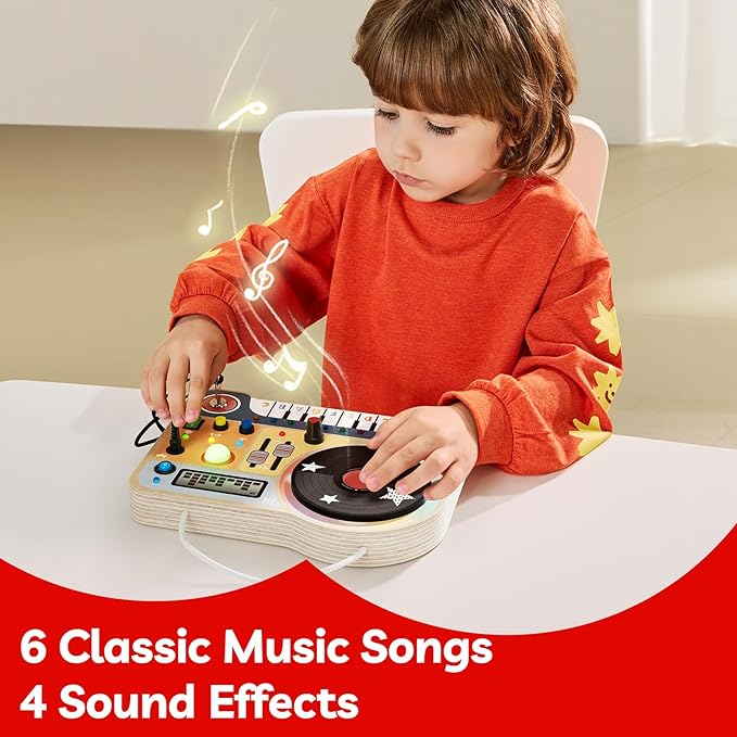 - DJ Sound Explorer Module: Our DJ busy board features 3 classic music tracks and 3 music styles (piano, drum, reverb) with 4 sound effects (3 synth button + DJ Scratch Disc) —ideal for stimulating auditory development and rhythm discovery in toddlers 1-3.