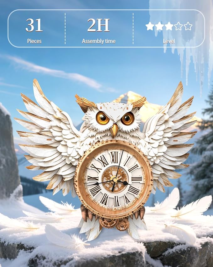 - 🏡 【Practical and Decorative Dual Use】:After assembly, it is not only an exquisite snowy owl-themed decorative artwork but also a practical clock with accurate timekeeping. The 3D snowy owl clock puzzle can be hung on the living room wall as a visual focus or placed on a desk, bookshelf, or bedside table, adding natural elegance to modern homes and office spaces.