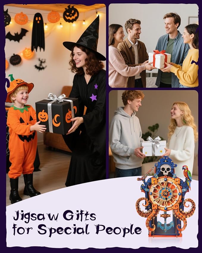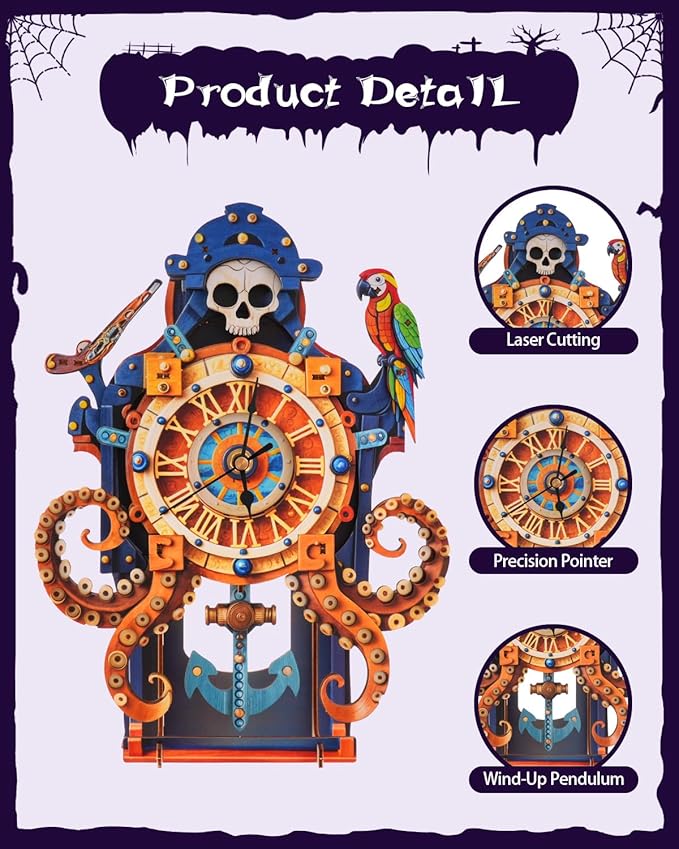 - 【Octopus-Themed】: Topped with a creepy skull, a lifelike parrot perches on its shoulder, guarding it. Powered by time, this 3D octopus-themed wooden clock blends nautical mythology, mechanical magic, and dark allure into a striking centerpiece perfect for unconventional decor lovers and puzzle enthusiasts