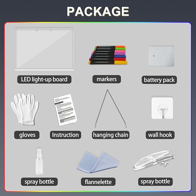 - Super complete accessories: Our LED drawing board comes with 1 acrylic drawing board, 1 spray bottle, 1 cleaning cloth, 2 hanging hooks, 1 chain, 1 battery box that requires 4 AA batteries, 2 invisible brackets, 1 nano bar, and 1 pen holder