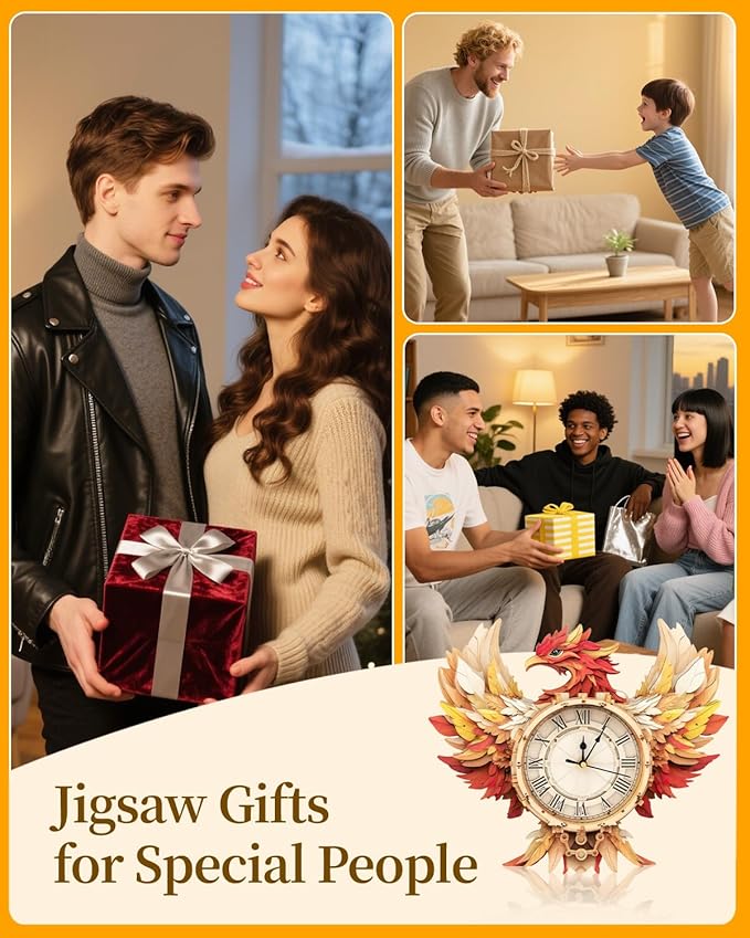 - 【Phoenix Clock Theme】: This stunning 3D phoenix clock puzzle, featuring a classic roman numeral dial, a movable pendulum, and rotating hands, combines mythical beauty, timeless charm, and whimsical artistry. It's ideal choice for puzzle enthusiasts, adults who appreciate unique craftsmanship, and anyone seeking a personality decorative piece