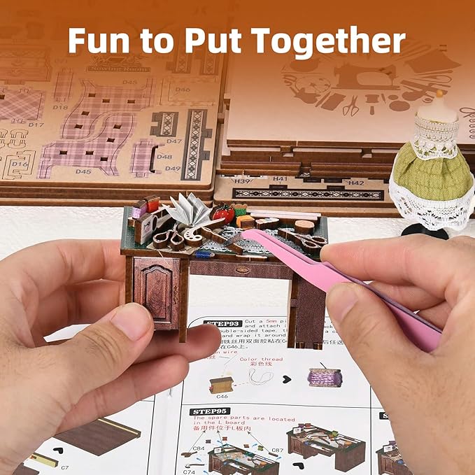 - 【Rich Material Kit to Inspire Creative Customization】 This sewing room book nook kit comes with a wide variety of materials, including fabric, tulle, lace, ribbon, pearls, PVC sheets, and colorful printed stickers, making it different from other ordinary book nook kits. You can fully unleash your creativity by using the included fabrics or your own to design dresses and clothing, and even incorporate your own ideas to create truly personalized and one-of-a-kind miniature pieces.