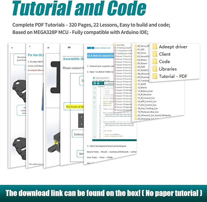 - 【Easy to Assemble and Build】 Detailed tutorials(220 Pages, 20 Lessons) and complete code are provided. The download link can be found on the card in the box(Paper tutorials are NOT available as the tutorials are updated frequently).