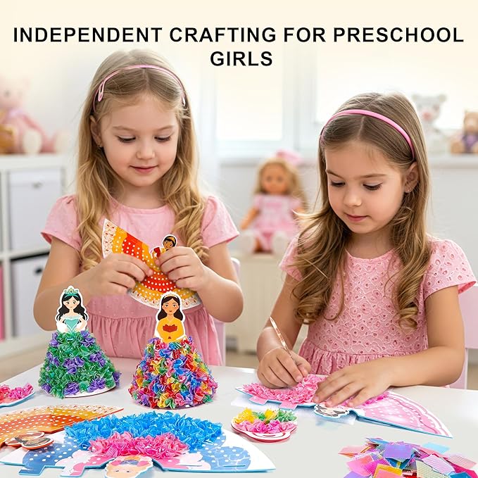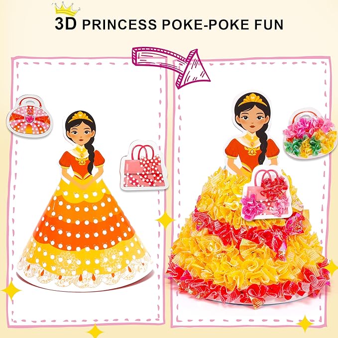 - โจ Super Easy & So Satisfying: Place, poke, connect and create! Our simple method lets kids craft with ease. Just put a foam princess on the cotton pad, poke the fabric squares in with the poke-in stick, and watch the dazzling gown appear. Connect the pieces โ she stands up ready for adventure!