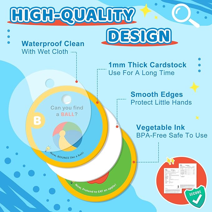 - HIGH-QUALITY:Engineered to survive even the toughest toddlers, these ultra-durable cards feature 1mm thick lamination that's completely waterproof, chew-resistant, and effortlessly wipes clean from spills and sticky fingers. Made with 100% child-safe, non-toxic materials .Every card has soft rounded corners for worry-free handling and is free from BPA, lead, and phthalates - because safety is just as important as fun!