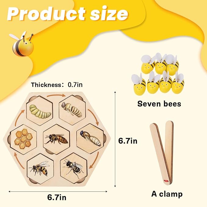- [Engaging Life Cycle Learning]:This Adena Montessori Wooden Bee Life Cycle Toy features a wooden tray, 7 hexagonal blocks depicting the bee’s life stages from egg to adult, and a clip. Combine the joy of puzzles with scissor - like play, sparking curiosity in nature and enhancing 3 - 6 year olds’ fine motor skills. Ideal for preschool science education activities.