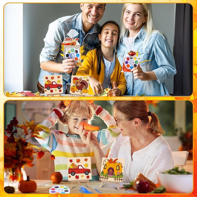 - Fall Thanksgiving Unfinished Wood Crafts Set: you will receive 12 sets of fall wood crafts set including 12 mini unfinished wood, 12 mini easels, 12 paint trays, 12 paint brushes, 12 plastic bags, 12 fall theme cards, 12 Thanksgiving cartoon cutout, and 150g raffia paper filaments in 3 color, sufficient quantity, and suitable size for you to use on DIY craft projects, you can also share them with your friends