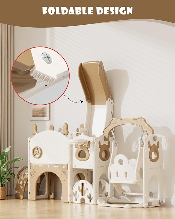 YUFU 13 in 1 Toddler Slide and Swing Set, Kids Slide for Toddlers Age 1-3, Toddler Playset with Golf Set, Basketball Hoop and Drawing Board, Outdoor Indoor Playground (Brown)