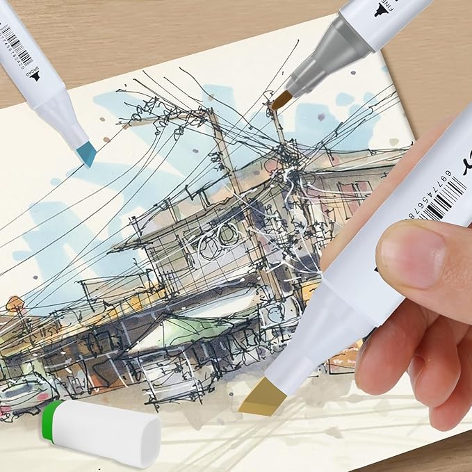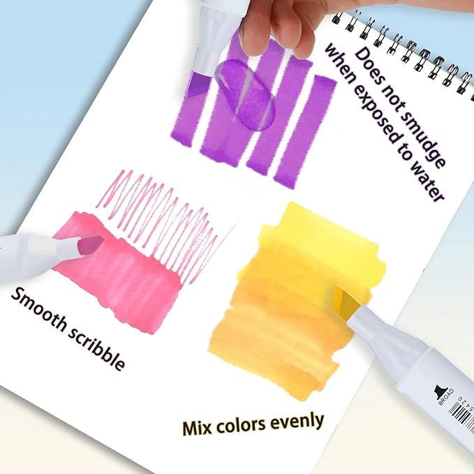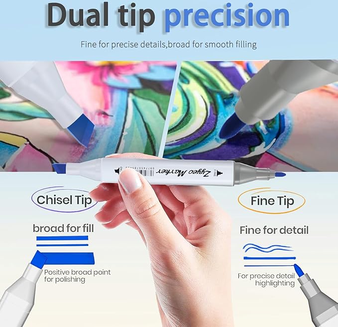 - Dual Tips Alcohol Markers:The markers feel very sleek and are comfortable to hold. The tips looks great on all of them. Not a single one had a issue of being dried out. The caps can be indicate for what the color like these you need so you know how the colors will looks while coloring.you can choose what you opt for colors, No bleeding issues and grate color.Fine tip 1mm and Broad tip 6mm both tips for precise highlighting, sketching and underlining. You can at your fingers switch between broad strokes and fine details, making your creative process smoother and more enjoyable.
