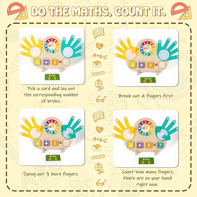 - 【Interactive Math Games】 Math manipulatives game toys include 1 wooden finger board,12 colorful number blocks,23 athematical calculation card,18 time teaching card and a holder. Kids can match blocks to numbers, solve simple equations, or follow flashcard challenges making math visual, engaging fun!