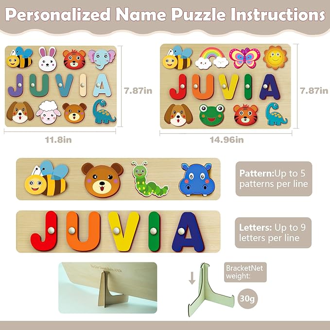 - 【Personalized Baby Gifts】 A wonderful gift for the little ones in your life. making your gift unique and Memorable, These personalized wooden name puzzles are a perfect combination of fun and education to give for baby showers, birthdays, Christmas and New Year! Gifts for 1 2 3 Years Old/ Gifts for 12 18 24 36 month