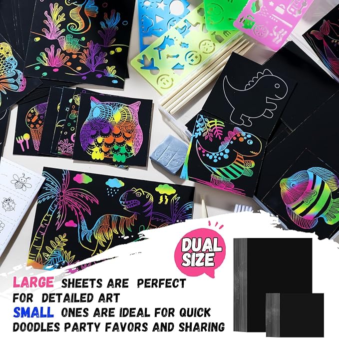 - All-in-One Great Value Pack: Get ready for endless fun with our 100-pack of rainbow scratch art paper! This value set includes 30 large sheets (4.7" x 6.8") and 60 standard sheets (3.3" x 3.3") to bring your creative ideas to life. You'll also get 10 stenciled sheets with pre-printed outlines, 4 drawing stencils, 5 wooden styluses, 1 step-by-step drawing tutorial, 1 cleaning brush, 1 cleaning tool, and 1 handy plastic organizer case for a complete fun scratch art experience.