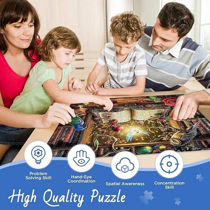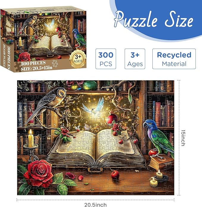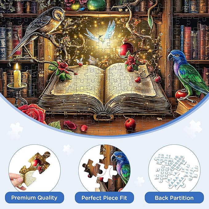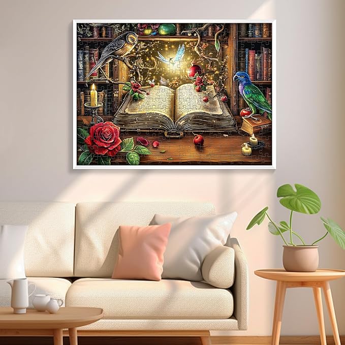 - Vibrant Artwork: This puzzle depicts a magical book open in candlelight, with golden light streaming from the pages. Blue-feathered birds flutter in flight, while branches entwine with roses and fruits. An owl and a parrot stand quietly nearby, guarding this dreamlike wonderland