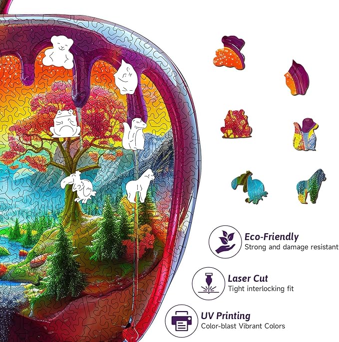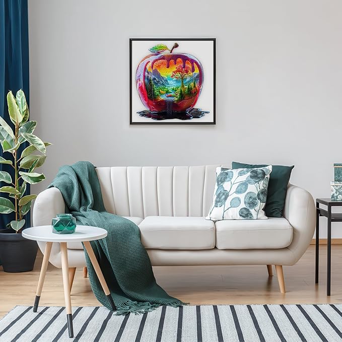 - Fantasy Apple Landscape Design: Special apple shape with a colorful landscape inside mountains, trees, rivers. Looks like a melting apple with art inside. Super eye - catching, perfect for home decor and puzzle lovers