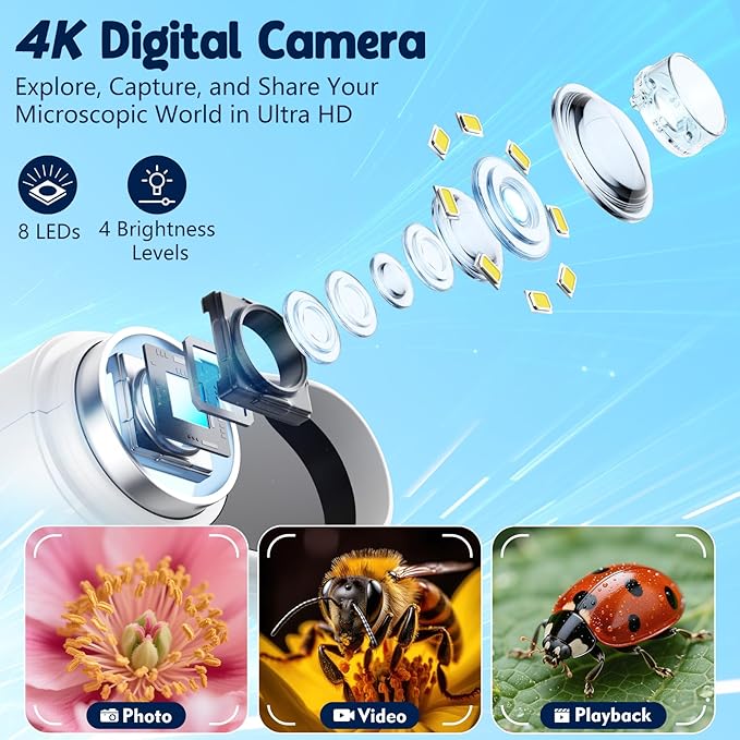 - 4K HD Camera & Display: Equipped with a 4K HD camera and 2.4” screen, this kids microscope supports photo taking, video recording, browsing, and deleting. With 3-level adjustable brightness and 8 built-in LED lights, kids can clearly explore the microscopic world anytime