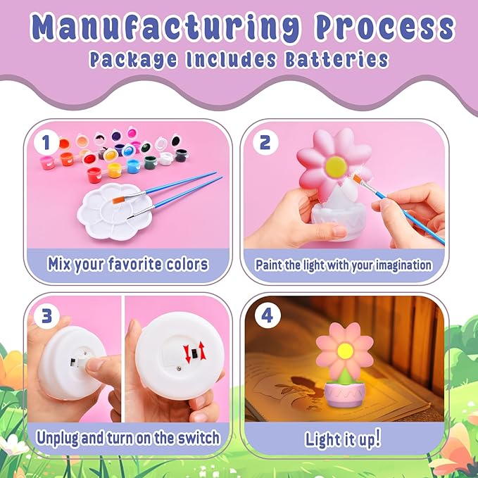 - 8-PETAL FLOWER LAMP PAINTING CRAFT TOY SET: This set includes the 8-petal flower-shaped lamp, 2 paintbrushes, 12 colors of paint, and a painting tray. Children explore creative expression through simple, enjoyable painting activities, perfect for young artists just beginning their creative journey