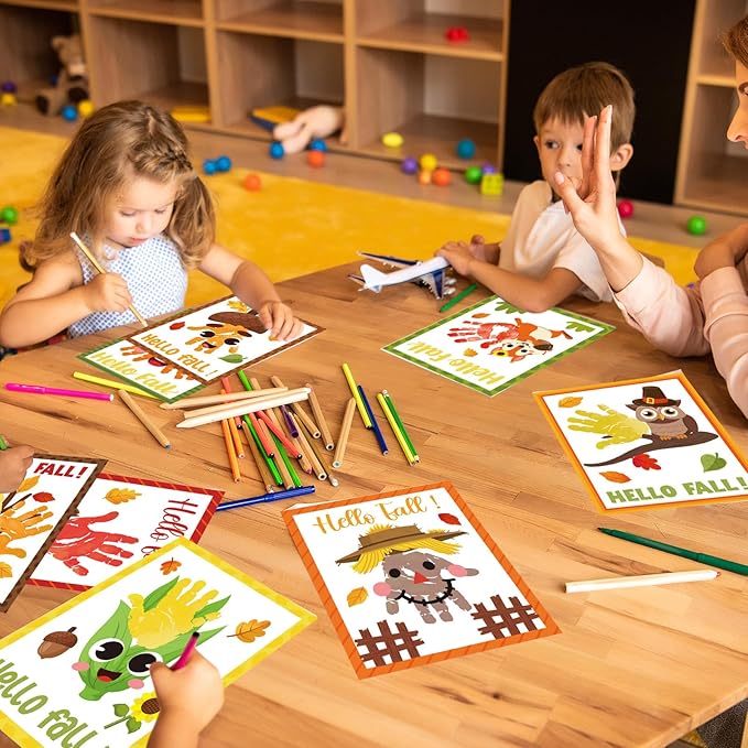 - Hello Fall Handprint Kit Design:Use exquisite sticker designs including acorns, hedgehogs, owls, squirrels, corn, scarecrows, pumpkin stems, and more to embellish your DIY art handprints and create unique Thanksgiving crafts.The fall activities sets include a ribbon for easily hanging your creations on walls, windows, or in hallways, adding a unique touch of seasonal charm