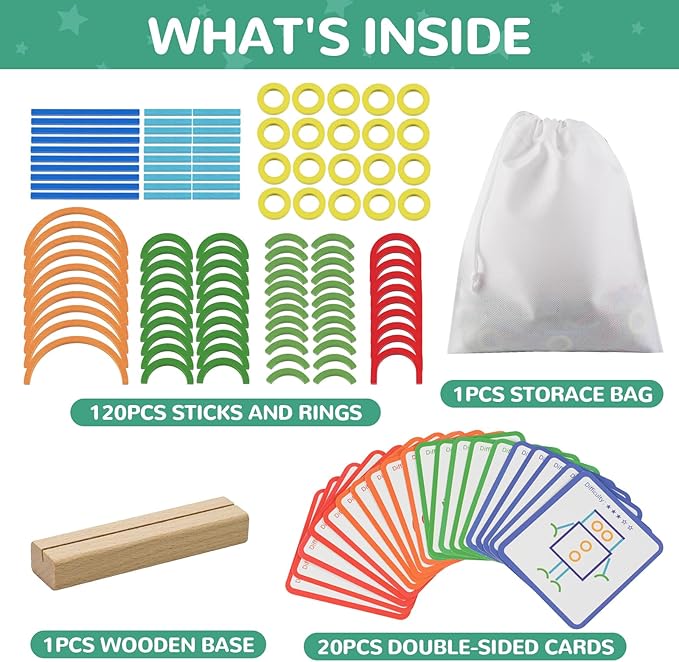 - 【STEM Skills Through Play】Children enhance their logical thinking and early engineering skills by stacking rings, arranging sticks, and completing shape challenges – a perfect introduction to STEM education at home or in the classroom.