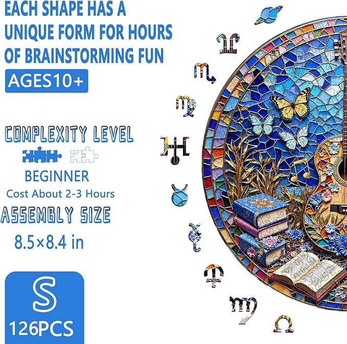 Wooden Puzzles for Adults, Stained Glass Guitar Wooden Jigsaw Puzzle for Adults, Music Books Wood Puzzles Adult, Unique Shape, Fun Presents for Friends, Wall Art Home Decor(S -8.5 * 8.4in-126 pcs)