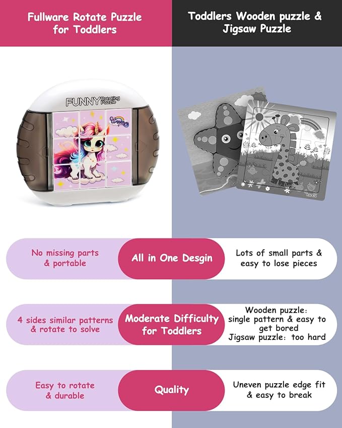 - A HANDY TOY FOR OUTINGS - Whether in the car or at a restaurant, our compact Rotating Puzzles can be carried along and it keeps children quiet and occupied. Moreover, there is no risk of missing pieces after playing with this all-in-one design puzzle!