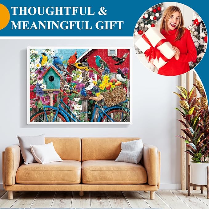 - 🚲【300-Piece Birdhouse by the Red Barn】 – A rustic red barn with a blue birdhouse, blooming flowers, and vibrant birds brings a cheerful countryside moment to life in every piece. Finished size: 20.5 x 15 in.