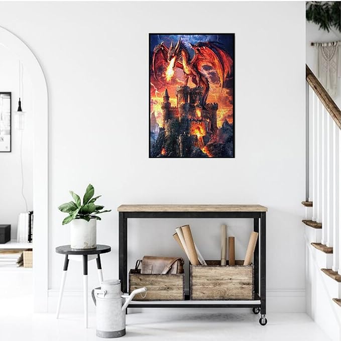 Dragon Puzzle for Adults 1000 Pieces Fantasy Red Dragon Fire Castle Puzzles Colorful and Unique Challenging Puzzle for Game Nights